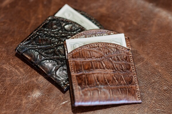 Front pocket wallets made from American alligator are displayed at the Col. Littleton leather goods store Friday, March 6, 2026, in Lynnville, Tenn. (AP Photo/George Walker IV)