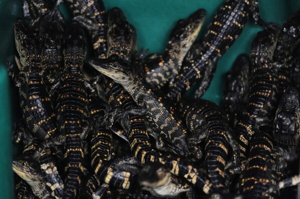 Baby alligators congregate in a holding tank Tuesday, Jan. 20, 2026, at Rockefeller Wildlife Refuge in Grand Chenier, La. (AP Photo/Joshua A. Bickel)