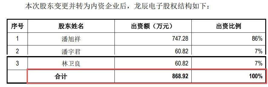 In 2004, benefiting from policies like “home appliance rural subsidy,” Longchen Electronics’ business began to grow. From 2008 to 2010, Longchen Electronics transitioned from a Sino-foreign joint venture to a domestic enterprise. Among them, foreign shareholder Nuoxun transferred its 28% stake to Huang Zhiren, who then, along with Foshan Shengxiang, transferred all shares to Pan Xuxiang, Lin Weiliang, and Pan Yujun.