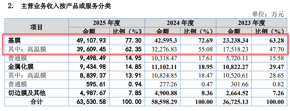 Among them, the company’s core product, base film, achieved revenues of 232 million yuan, 426 million yuan, and 491 million yuan, accounting for 63.28%, 72.69%, and 77.30% of the main business income, respectively.