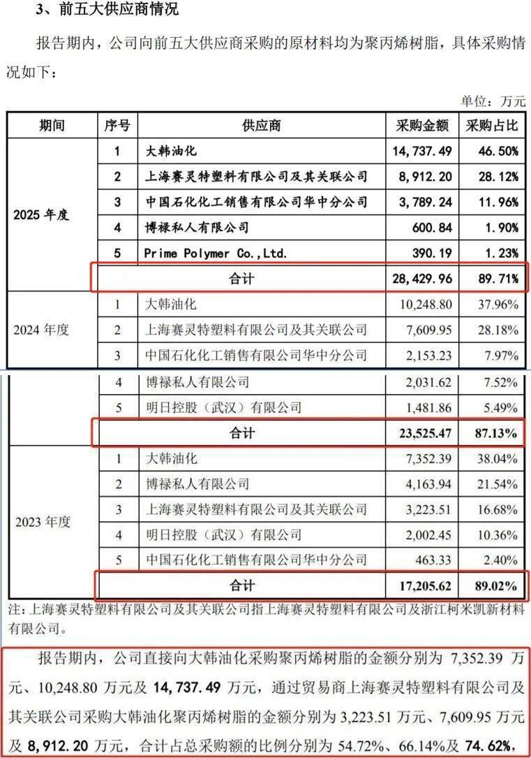 During the reporting period, the company directly purchased polypropylene resin from DaHanh Oil Chemical for 73.52 million yuan, 102 million yuan, and 147 million yuan, respectively. Purchases from the trading company Shanghai Sailite Plastic Co., Ltd. and its related companies amounted to 32.23 million yuan, 76.10 million yuan, and 89.12 million yuan, respectively, accounting for 54.72%, 66.14%, and 74.62% of total procurement. This indicates a reliance on DaHanh Oil Chemical.