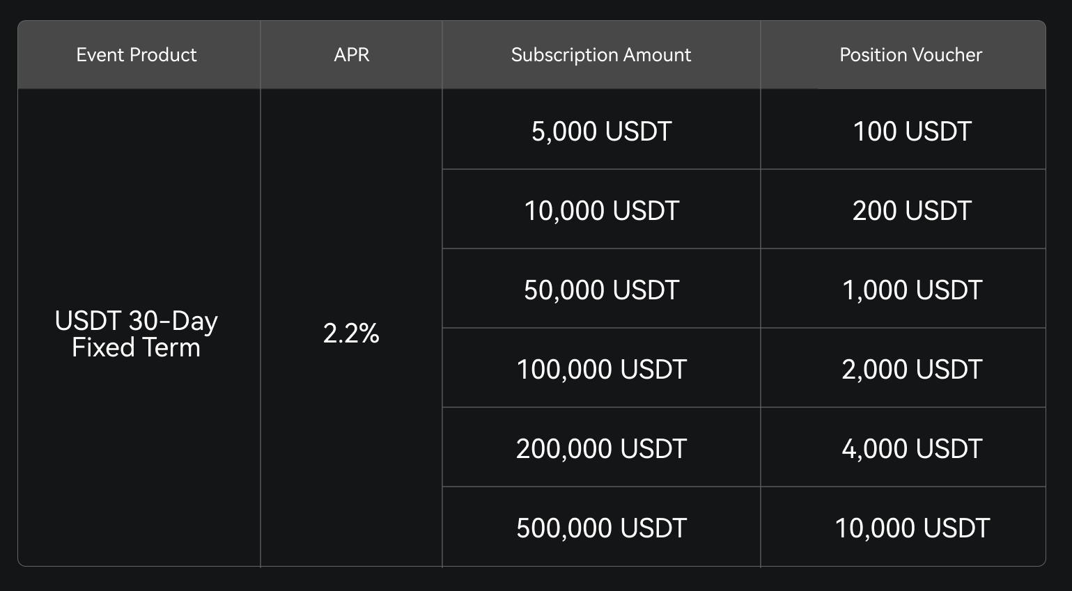 - As quotas dos produtos do evento são limitadas e atribuídas por ordem de chegada. Para regras detalhadas sobre subscrição, resgate e distribuição de juros, consulte a página de subscrição do produto.