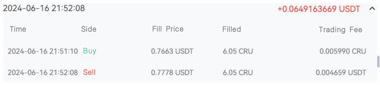 Por exemplo: O utilizador B criou uma grelha CRU à vista com um intervalo de preços de 0,2 a 2,5 USDT, o número de grelhas era de 200/Sequência aritmética e comprando 6.05 CRU por grelha. De acordo com os parâmetros da grelha, a diferença de preços por grelha deveria ser de 0,01155779 USDT e o retorno por grelha deveria ser de 0,06992463 USDT. No entanto, na negociação efectiva, existem derrapagens e taxas de negociação. A diferença de preço por grelha pode ser menor do que o valor teórico. Consequentemente, os lucros da grelha podem ser inferiores ao valor teórico.
