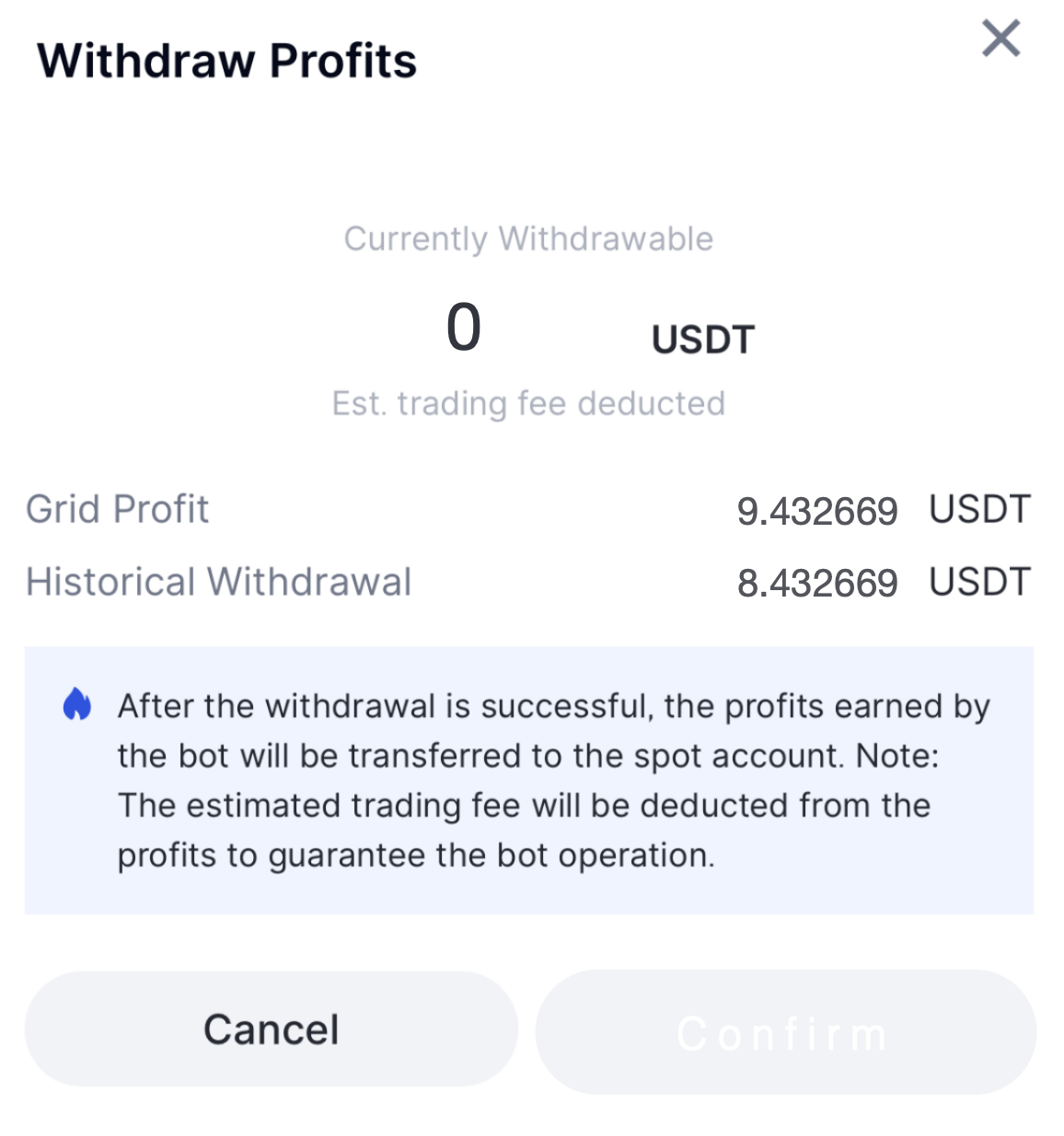Nos Bots da Gate, a maioria dos mercados exige atualmente uma ordem mínima de 1 USDT. Este USDT será retido para colocar ordens e comprar o token de base como uma dedução de taxa. Como resultado, o utilizador A não pode retirar o montante do lucro da grelha apresentado na interface da grelha.