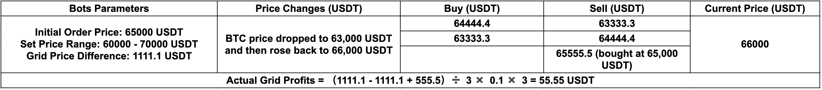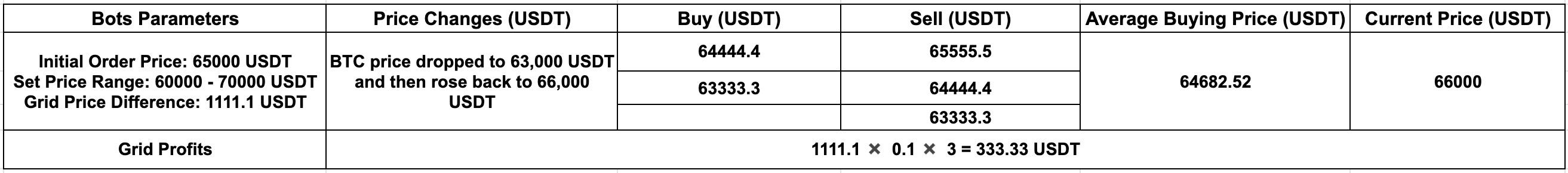 Por exemplo: Supondo que o utilizador C criou uma grelha à vista para BTC ao preço de 65.000 USDT, com um intervalo de preços de 60.000 a 70.000 USDT, número de grelhas de 10/Sequência aritmética, comprando 0,1 BTC por grelha, e inicialmente comprou 0,5 BTC como base para negociar. Posteriormente, o preço da BTC caiu para 63.000 USDT e subiu para 66.000 USDT. Vamos verificar os lucros teóricos da grelha e os lucros reais da grelha separadamente. Lucros da grelha exibidos nos Bots da Gate (valor teórico): 333,33 USDT