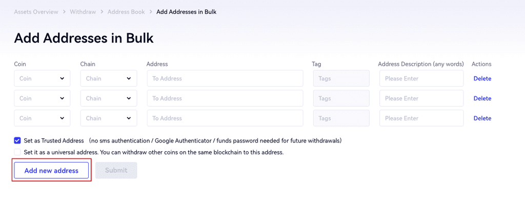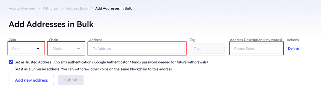 Após a configuração dos endereços fiáveis, os utilizadores não precisam de passar pelo processo de verificação regular, que inclui código de verificação por SMS, código de verificação por e-mail, código do autenticador Google/ Gate e palavra-passe do fundo. Certifique-se de que os endereços são absolutamente seguros antes de adicioná-los ao catálogo de endereços.