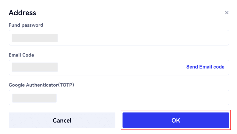 Passo 3. Introduza a palavra-passe do fundo, o código do Google Authenticator, etc., e clique no botão “OK” para adicionar os endereços.