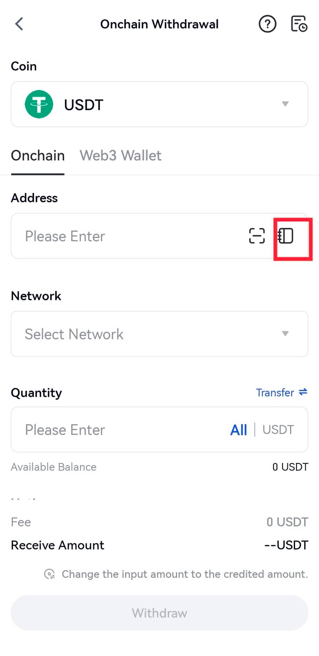Passo 2: Selecione “Levantamento on-chain” e depois selecione uma rede.
