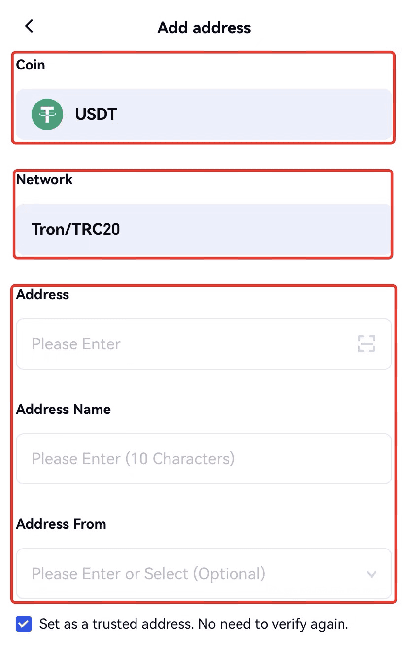 Passo 5: verifique novamente se selecionou a moeda e a rede corretas. Em seguida, introduza o endereço, nome do endereço, código do Google Authenticator, etc. Assinale a caixa “Definir como endereço fiável. Não é necessário verificar novamente” e clique em “Confirmar”.