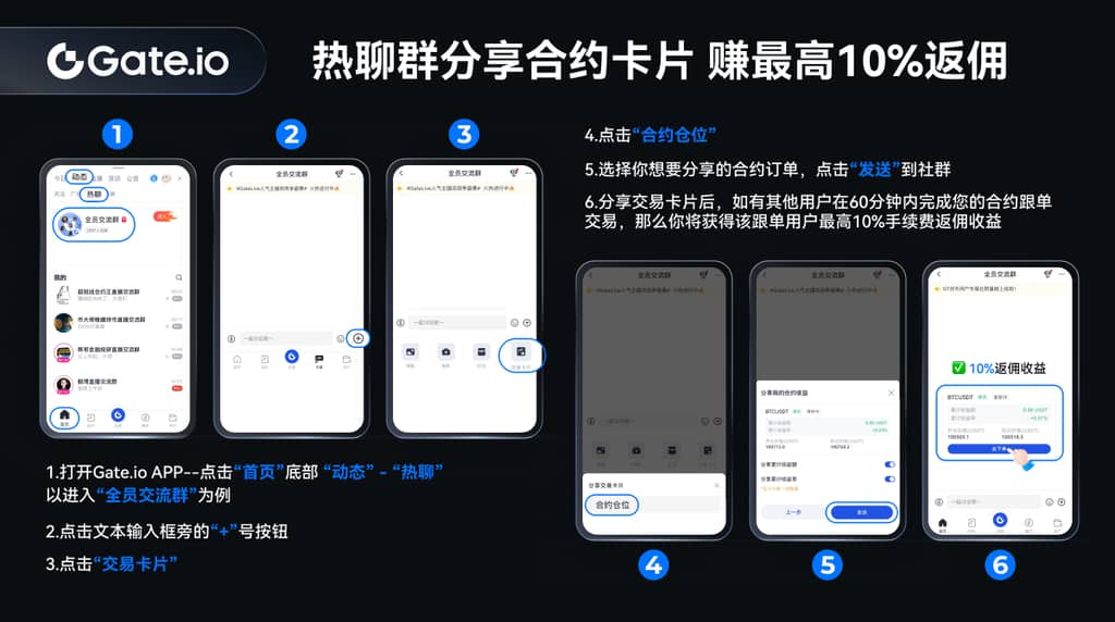 - Todos os utilizadores podem ir a Gate.io Dinâmica - partilhar o cartão de negociação de Posição de contrato em qualquer grupo de chat quente para a comunidade, ganhar comissões de rebate;