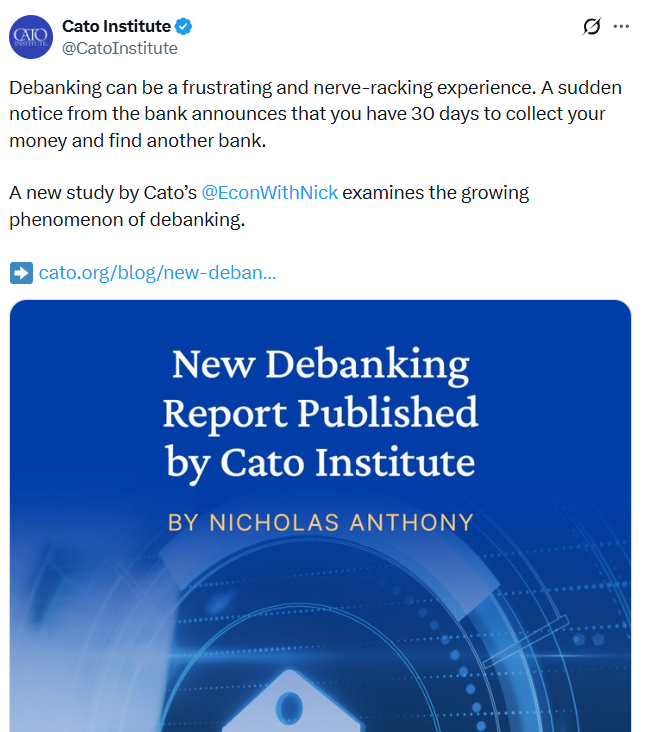 Fonte: CryptoNewsNet Título Original: O governo dos EUA está por trás da maioria dos casos de debanking, confirma nova pesquisa Link Original: A maioria dos casos de debanking nos EUA resulta de pressão governamental, e não de políticas de bancos individuais, de acordo com um novo relatório do think tank americano, o Cato Institute.
