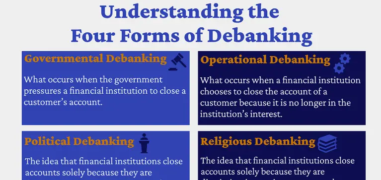O analista do Cato Institute, Nicholas Anthony, explicou em um relatório na quinta-feira que o debanking pode assumir várias formas: religiosa ou política, a ideia de que uma instituição financeira fecha contas unicamente devido a crenças ou filiações políticas ou religiosas; operacional, quando um banco decide encerrar a conta de um cliente porque não é mais do interesse do banco; ou governamental, quando um governo pressiona uma instituição financeira a fechar a conta de um cliente.