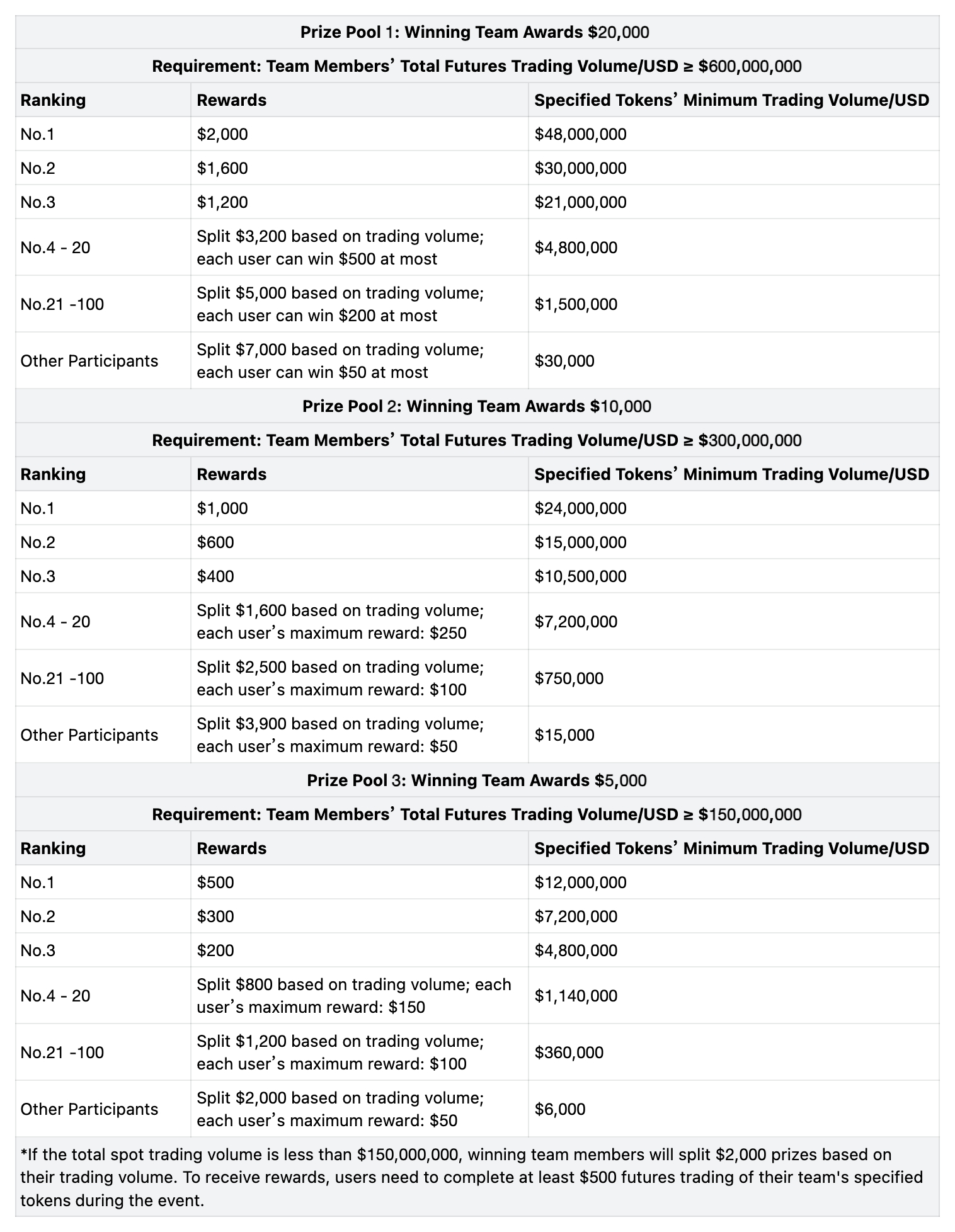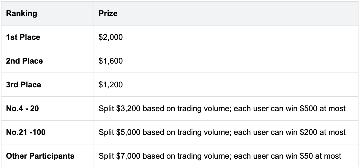 Во время мероприятия пользователи, которые присоединятся к команде и завершат торговлю фьючерсами указанных токенов на сумму не менее 200 долларов, разделят 2000 долларов вознаграждения пропорционально своему объему торговли.
