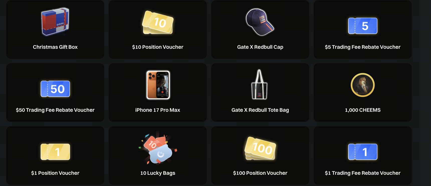 - Ваучеры на позиции, токены, Lucky Bags будут распределены в течение 30 рабочих дней после окончания мероприятия. Призы в виде мерча будут отправлены в течение 60 дней после окончания мероприятия. После проверки награды будут отправлены. Пожалуйста, следите за информацией о доставке. В случае неудачной доставки по логистическим причинам мерч будет заменён эквивалентным ваучером на позиции (iPhone 17 Pro Max будет заменён на ваучер на позиции на $1 000, рождественский подарочный бокс Gate — на ваучер на позиции на $200, сумка Gate × Red Bull — на ваучер на позиции на $30, кепка Gate × Red Bull — на ваучер на позиции на $20).