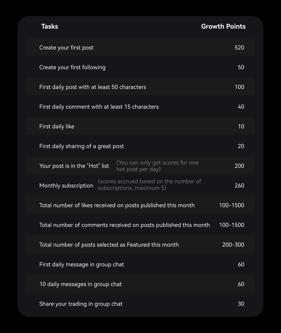 Выполняйте задания, такие как публикации, комментарии, лайки и взаимодействие, чтобы получать соответствующее количество баллов роста.