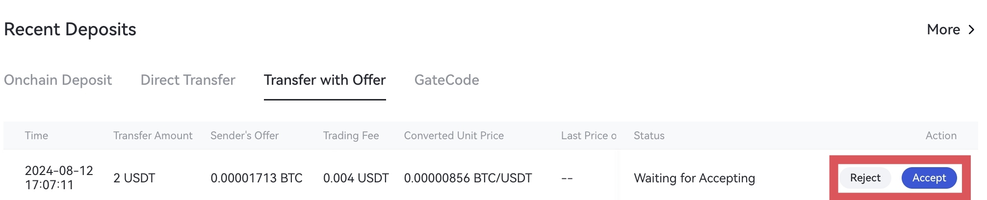 6.Получатель платежа может просмотреть детали перевода, выбрав “Прямой перевод” или “Перевод с предложением” в разделе “Активы” - “Депозиты” - “Последние выводы”, а затем нажать “Получить/Принять” или “Отклонить”. Если получатель платежа отклонит перевод, замороженные средства будут возвращены на счет отправителя.