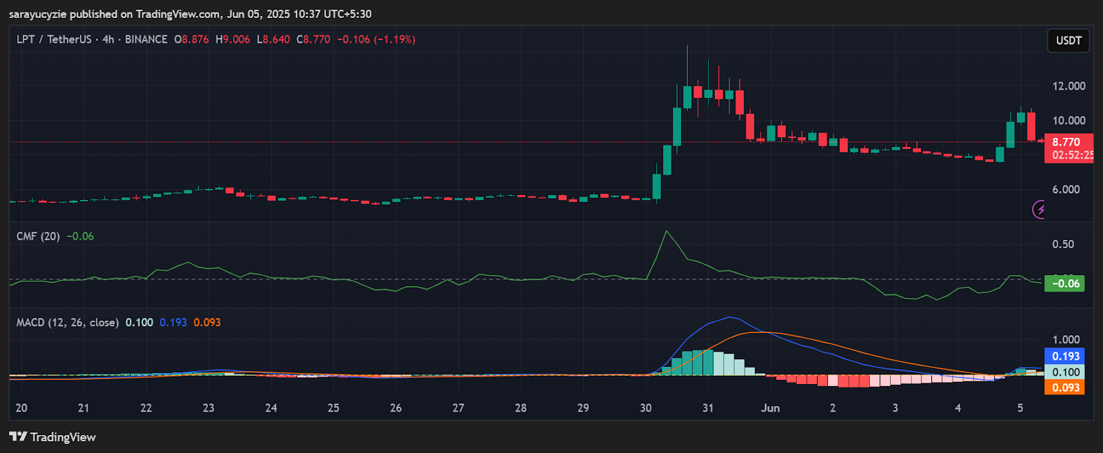 ! *LPT график (Source: TradingView)*Кроме того, линия (MACD) схождения и расхождения скользящей средней актива расположена выше сигнальной линии. Это говорит о бычьем сигнале на рынке, и давление покупателей может усилиться. Возможно, будет еще больше возможностей для роста. Индикатор (CMF) денежных потоков Чайкина от Livepeer находится на уровне -0,06, что указывает на небольшие медвежьи настроения, когда деньги утекают из актива. Давление со стороны продавцов было больше, чем покупок