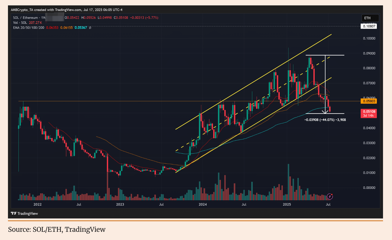 Динамика SOL/ETH слабая, рынок по-прежнему сосредоточен на Эфириуме Несмотря на рост Solana, курс SOL/ETH с апреля упал более чем на 44% и вышел за пределы трендового канала текущего цикла роста. Это указывает на то, что интерес рынка к ETH в последнее время превышает интерес к SOL.