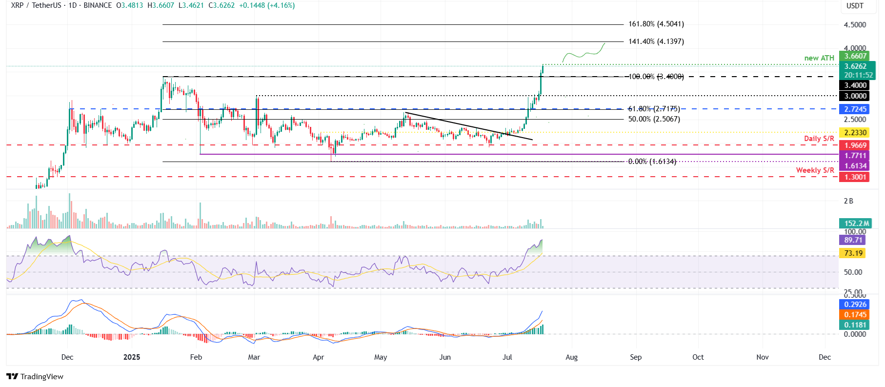 Цена XRP в среду закрылась выше ключевого психологического уровня в 3 доллара, а на следующий день выросла на 14,60%. На момент написания этой статьи в пятницу его цена продолжает расти, достигнув исторического максимума в 3,66 доллара.