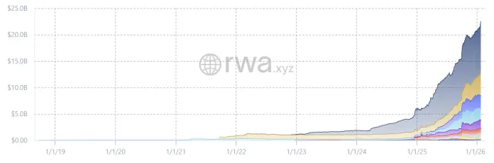 Согласно данным RWA.xyz, стоимость реально токенизированных активов реального мира, распределенных в блокчейне (Distributed Asset Value), в настоящее время составляет USD 23,18 млрд, с ростом более 11% за последние 30 дней. Эта метрика отражает капитал, выпущенный и функционирующий on-chain, и явно исключает stablecoins.