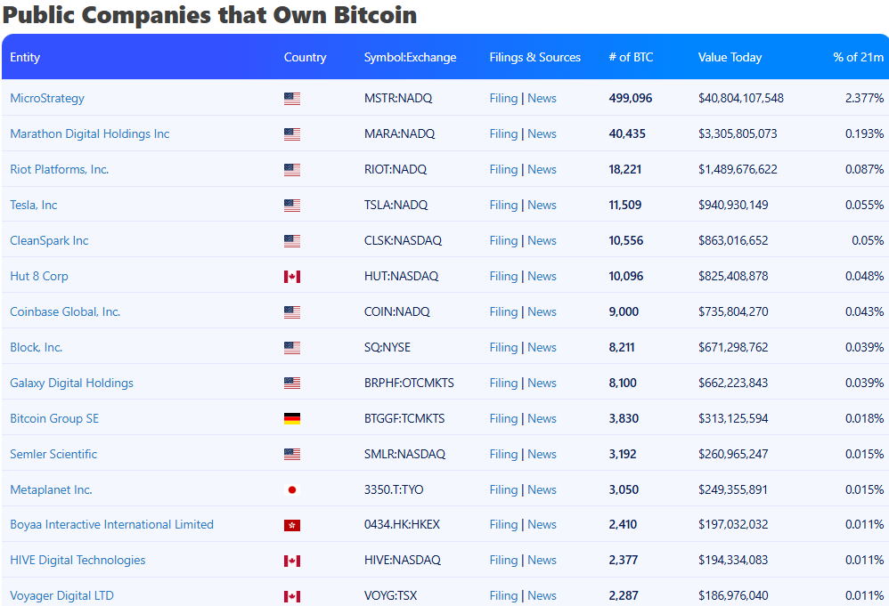List of 15 public companies that own the most Bitcoin globally according to Bitcoin Treasuries by BiTBO statistics, screenshot on March 18, 2025.