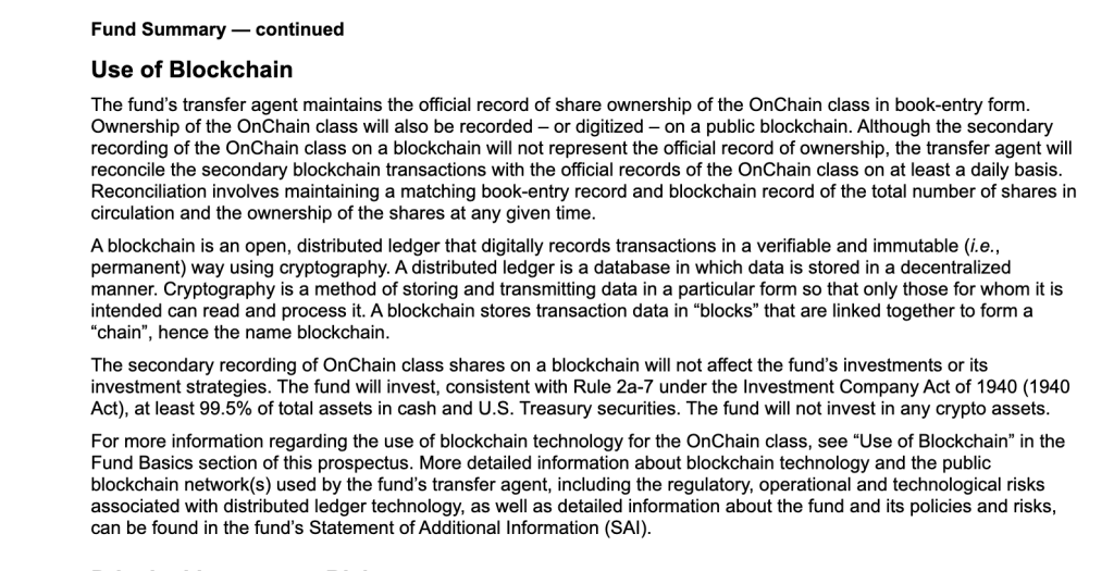 Fidelity’s approach is cautious but deliberate. By keeping the core asset structure unchanged and only recording a secondary ledger on-chain, the firm can test blockchain benefits without disrupting regulatory compliance or investor expectations. The fund itself remains a conventional money market vehicle — focusing on capital preservation, income generation, and liquidity — but now with an optional tech-forward twist.