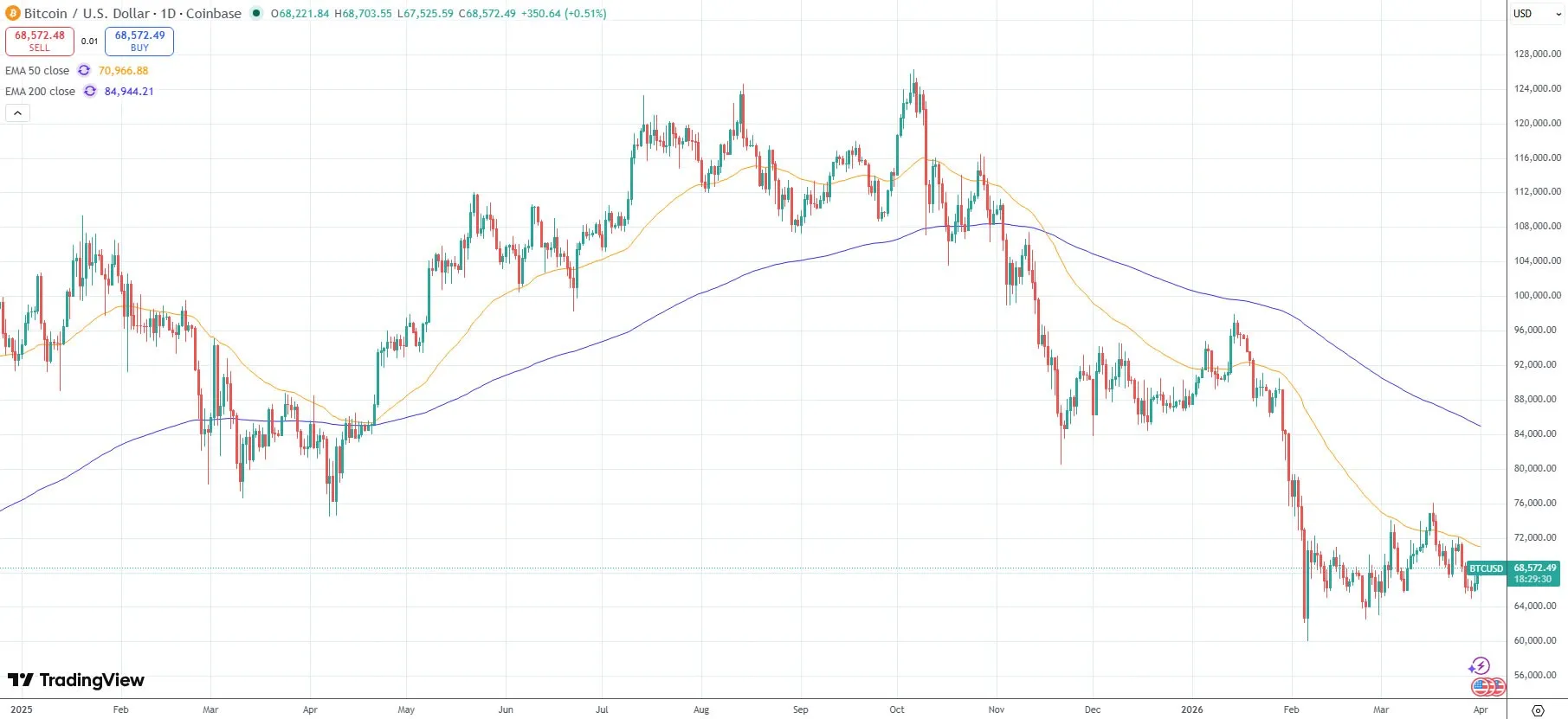 Coinbase BTC/USD daily chart. Source: TradingView.At the same time, the asset is consolidating around the $69,000 mark—above the 200-week EMA, which has historically acted as a significant dynamic support zone during corrections in bear phases of the market.