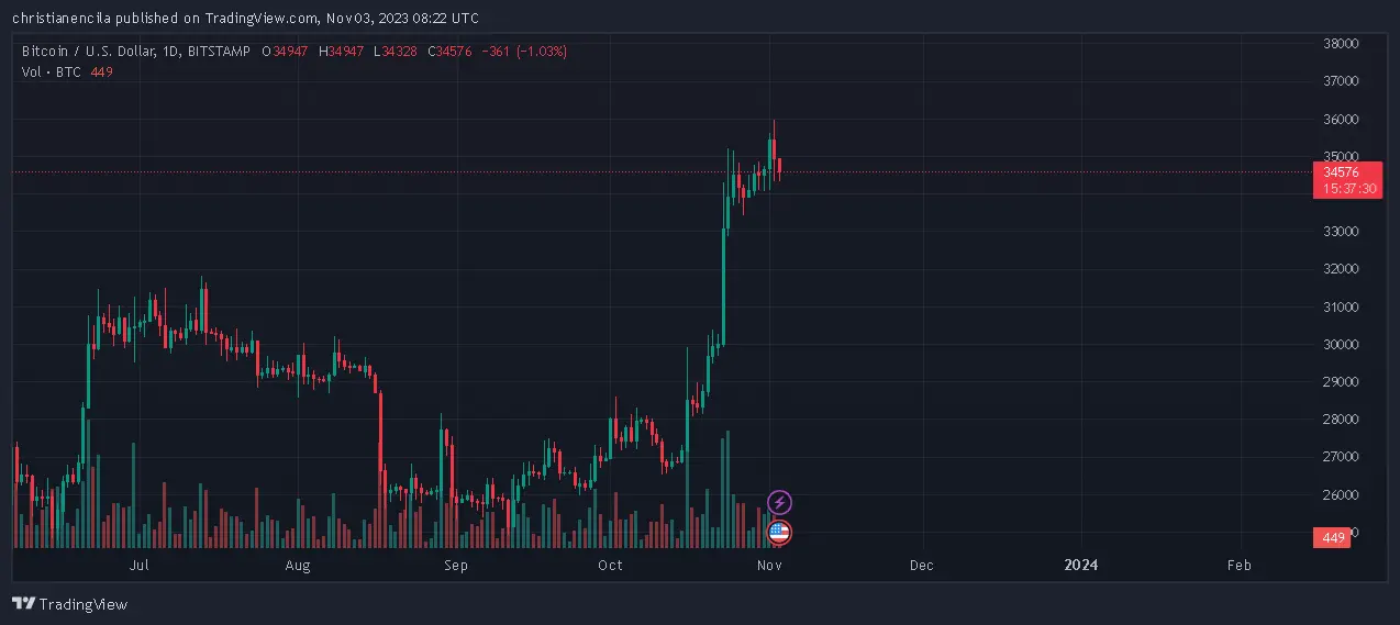 Bitcoin currently trading at $34,610 on the daily chart: TradingView.com