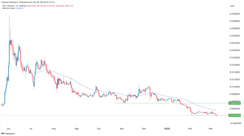 The Notcoin price has crashed as demand for tap-to-earn tokens failed. NOT has dropped to a low of $0.002070, its lowest level since May last year. It has plunged by over 94% from its highest level in 2024