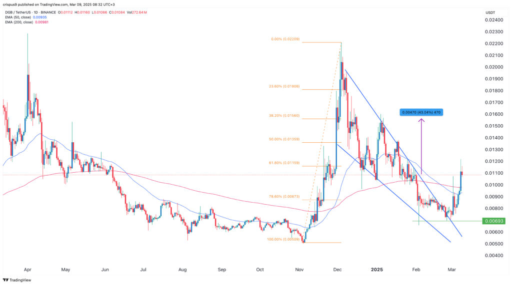 DigiByte is approaching the 61.8% Fibonacci Retracement level, while other oscillators have continued rising. Therefore, the DGB token will likely keep rising as bulls target the next key resistance level at $0.01560, up by over 43% above the current level.