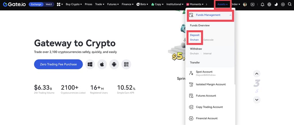 Крок 1: Увійдіть у свій акаунт Gate. Натисніть "Активи" - "Управління коштами" - "Депозит" - "Ончейн".