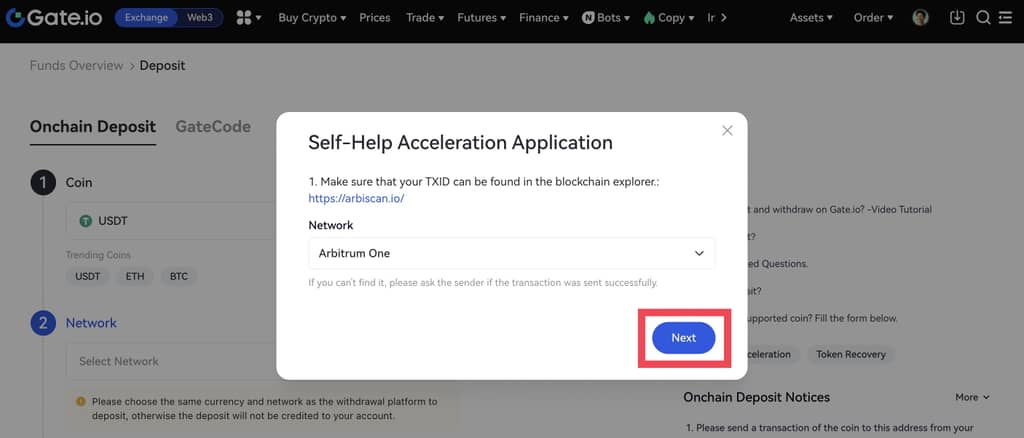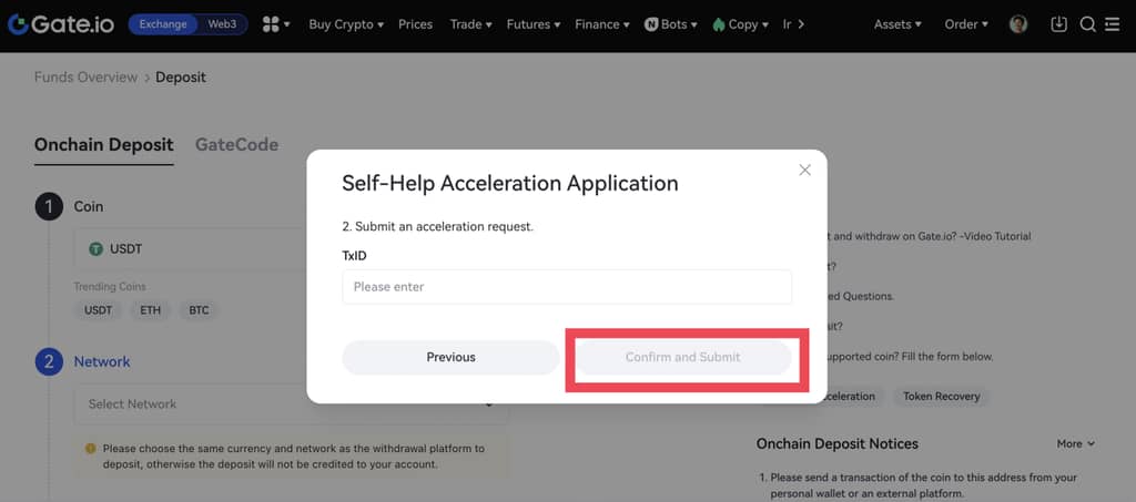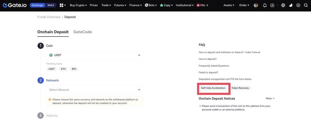 Для того, щоб покращити взаємодію з користувачами та вирішити проблему, що депозити займають занадто багато часу через перевантаження блокчейну або інші причини, Gate запустив функцію "прискорення самодопомоги". Якщо ви зробили депозит і чекали довше, ніж зазвичай, поки він буде завершений, або не можете знайти запис про депозит, ви можете скористатися функцією "прискорення самодопомоги", щоб прискорити процес.