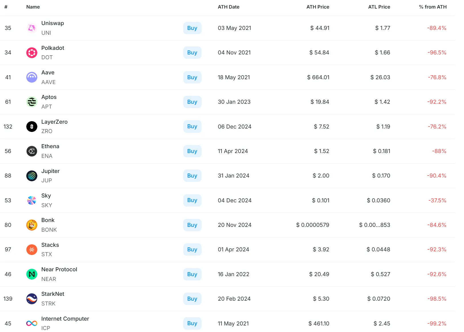 Ціни на провідні проекти у топ-150 за ринковою капіталізацією, з урахуванням усіх наративів, зараз значно нижчі за історичні максимуми.