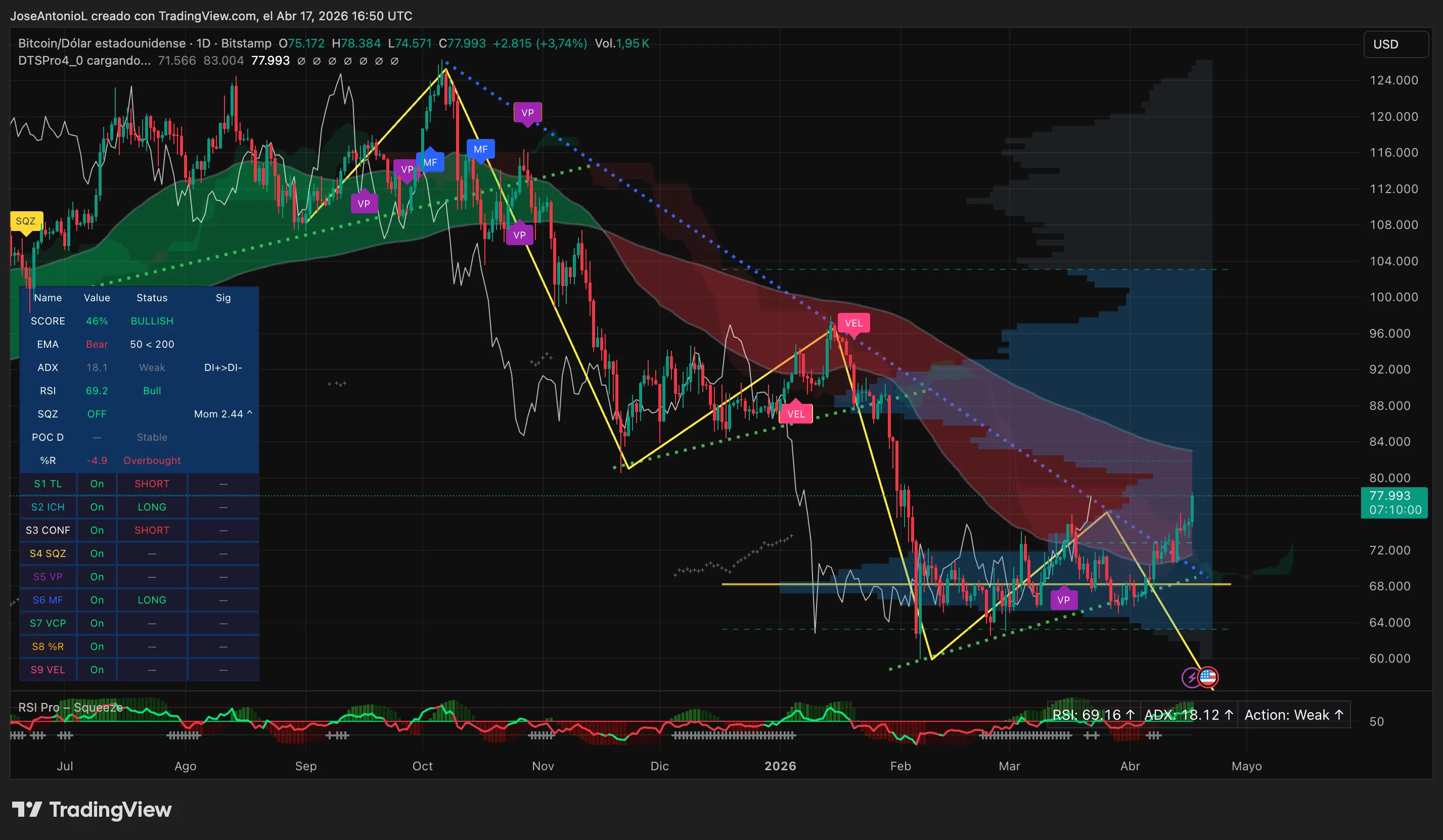 Макроекономічне середовище було жорстким для більшості 2026 року через напруженість на Близькому Сході, страхи інфляції, сильний долар і обмежену ліквідність, що тримало Bitcoin у виснажливому спаді з його піку в жовтні 2025 року на рівні $126 000. Бики моляться, щоб цього тижня ситуація змінилася. Bitcoin: порушення патерну, але не без небезпеки Сьогоднішня свічка на графіках Bitcoin є значущою. Bitcoin відкрився на рівні $75 172, і трейдери підняли цінову свічку до $77 205 — зростання на 2,7% за сесію, з внутрішньоденною максимальною позначкою $78 384. Цей рух, хоча й скромний, був ключовим для закріплення тези, що низхідна лінія опору, яка відхиляла Bitcoin при кожній спробі ралі з жовтня 2025 року, була, нарешті, скасована. Протягом семи місяців ця лінія була гравітацією. Це був перший тиждень, коли Bitcoin торгувався вище цієї лінії з початку формування медвежого патерну.