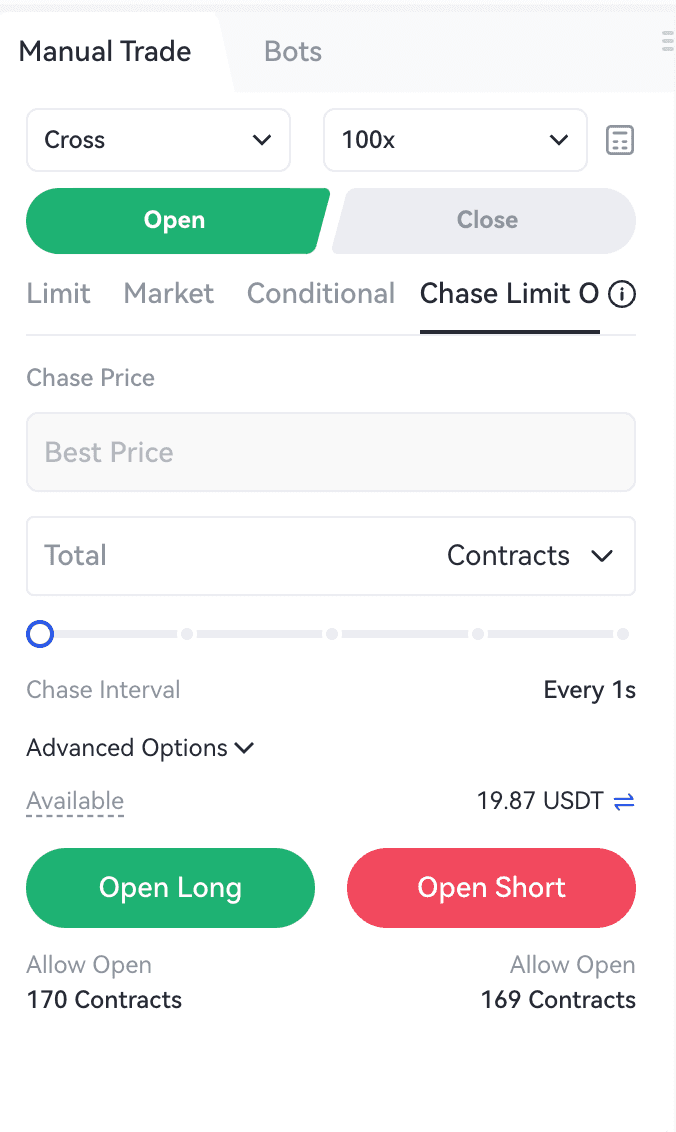 Bước 1: Chọn hợp đồng để giao dịch trên trang giao dịch và nhấn để mở rộng thêm các loại lệnh trong khu vực đặt lệnh, sau đó chọn "Lệnh giới hạn đuổi theo".