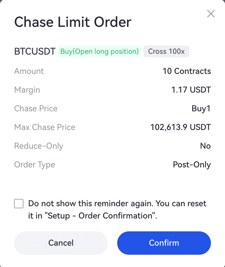 Người dùng A muốn mua 1 BTC và anh ta đặt lệnh giới hạn đuổi theo. Sau khi lệnh được gửi thành công, hệ thống sẽ đặt lệnh giới hạn cho 1 BTC dựa trên giá chào mua tốt nhất hiện tại. Khi giá chào mua tốt nhất thay đổi, các phần của lệnh có thể được thực hiện sẽ được thực hiện. Số tiền còn lại chưa được thực hiện sẽ được đặt ở mức giá chào mua tốt nhất mới nhất, lặp lại quá trình này cho đến khi tổng số tiền đạt 1 BTC hoặc Người dùng A hủy lệnh giới hạn đuổi theo theo cách thủ công.