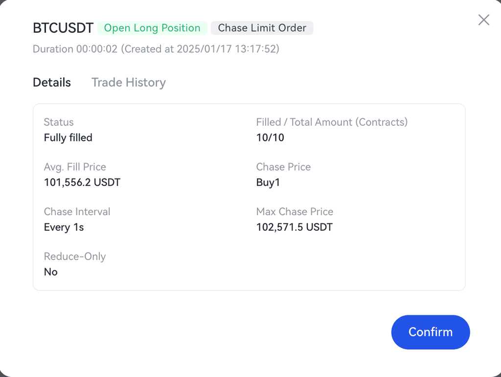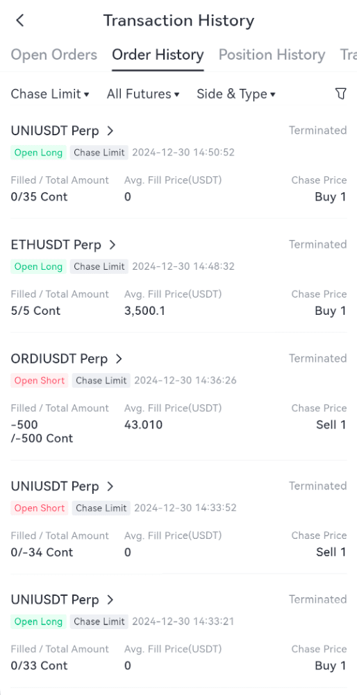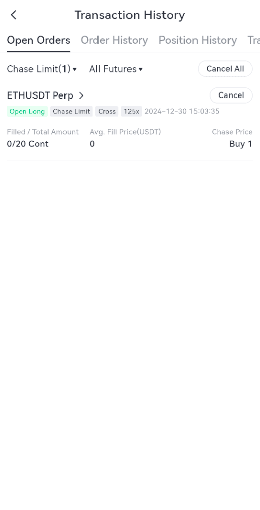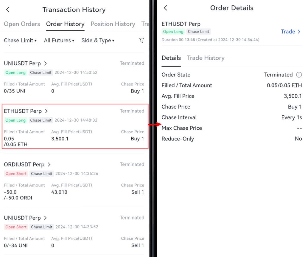 Các lệnh giới hạn đuổi theo được thực hiện hoặc hủy sẽ được hiển thị trong "Lịch sử lệnh". Bạn có thể chạm vào biểu tượng hóa đơn ở bên phải của "Vị thế" ở dưới cùng của trang giao dịch để xem các lệnh lịch sử. Dưới đây là hình minh họa về thông tin lịch sử lệnh giới hạn đuổi theo: