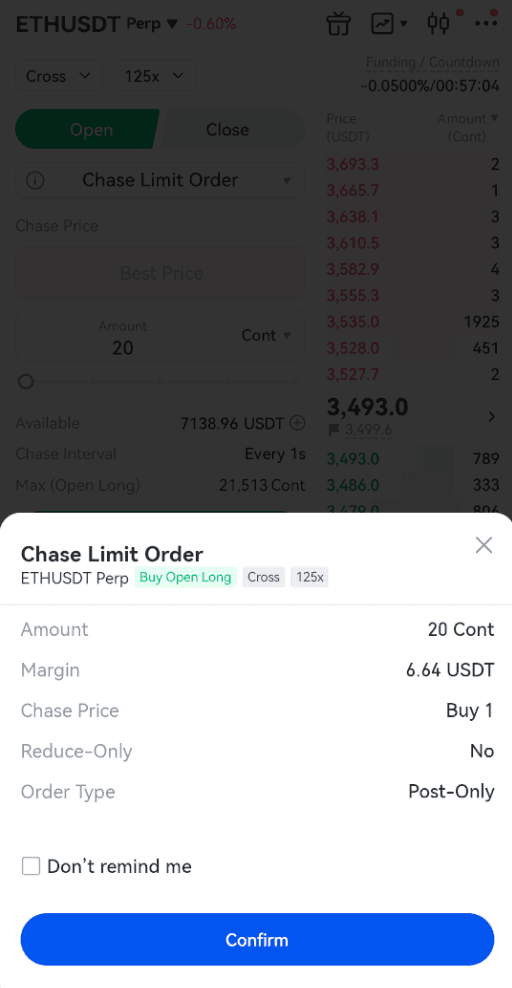 Lệnh giới hạn đuổi theo có sẵn cho tất cả các giao dịch tương lai vĩnh cửu (bao gồm USDT-M và BTC-M). Sau khi gửi lệnh giới hạn đuổi theo, hệ thống sẽ ngay lập tức cập nhật giá lệnh dựa trên mức giá tốt nhất hiện tại trên sổ lệnh cho cùng một bên giao dịch. Điều này giúp lệnh được khớp nhanh hơn đồng thời tiết kiệm phí giao dịch. Chúng ta hãy giải thích bằng một ví dụ.