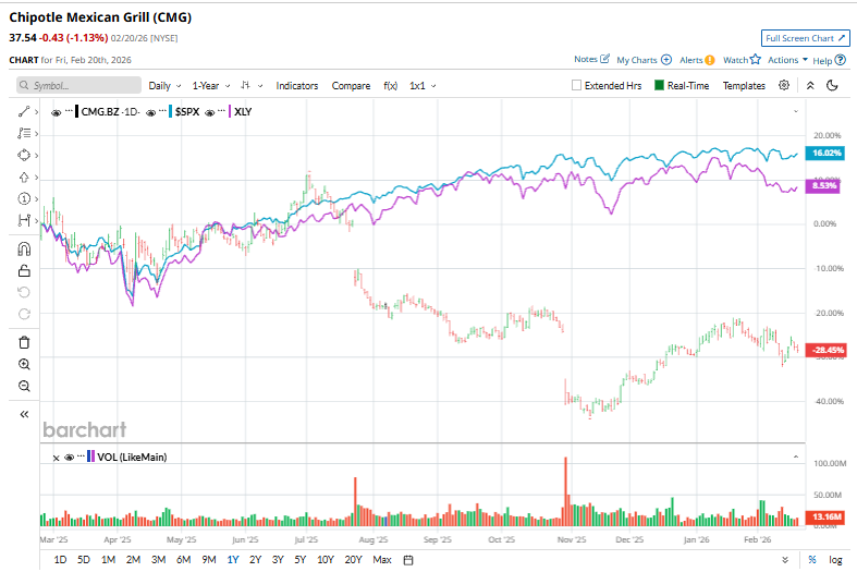 Gã khổng lồ nhà hàng này đã hoạt động kém hiệu quả hơn nhiều so với thị trường chung trong năm qua. Giá cổ phiếu CMG đã giảm 29,2% trong 52 tuần qua, so với mức tăng 13% của Chỉ số S&P 500 ($SPX). Trong năm 2026, cổ phiếu đã tăng 1,5%, vượt qua mức tăng nhỏ của SPX.