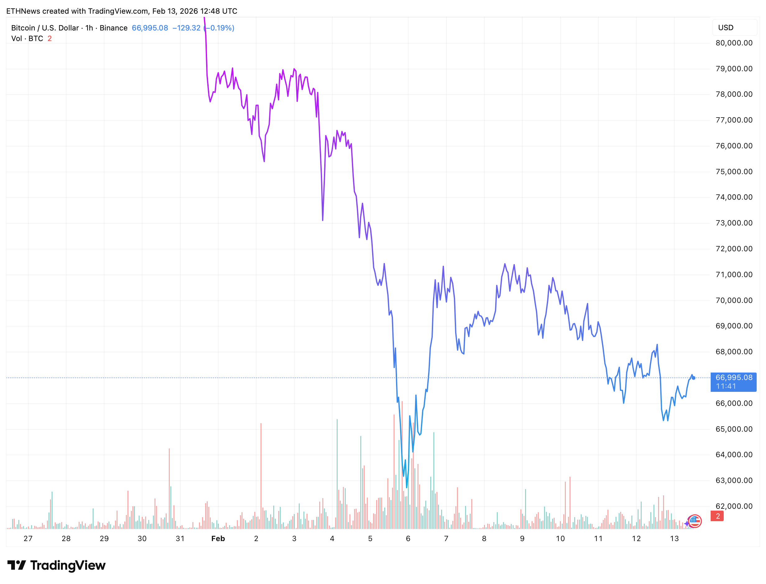 Xét khung thời gian 1 giờ, Bitcoin gần đây đã giảm từ vùng trên $79,000 về mức thấp cục bộ gần $64,000–$65,000. Giai đoạn bán ra mạnh nhất diễn ra vào khoảng ngày 5–6 tháng 2, khi những nến đỏ dài và các đợt tăng đột biến khối lượng cao ghi nhận một làn sóng đầu hàng rõ ràng. Động thái đó trùng với sự gia tăng rõ rệt về hoạt động giao dịch, cho thấy các đợt thanh lý bị cưỡng bức và việc bán tháo do hoảng loạn.