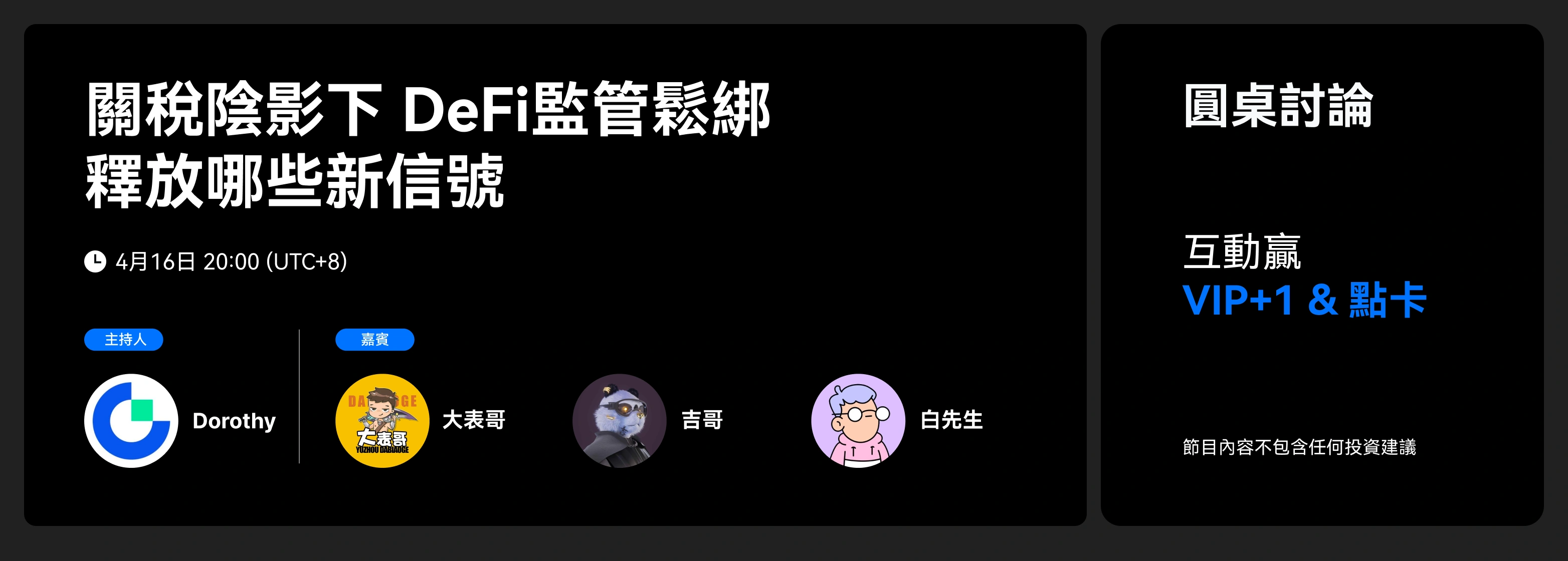 GateLive將於 4月16日 20:00(UTC+8)舉辦直播欄目《圓桌討論》。我們將邀請三位區塊鏈研究員,共同探討關稅陰影下,DeFi監管松綁對加密市場的潛在影響及投資者應對策略。觀看直播,直播間免費領空投:
