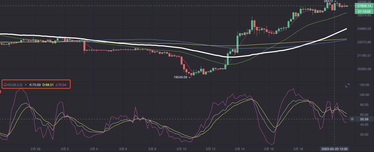③、 当K线与D线均大于80,而K线向下跌破D线时,表明市场即将由强势转为弱势,币价将下跌,这时应卖出大部分仓位,这就是KDJ指标死亡交叉的一种形式。