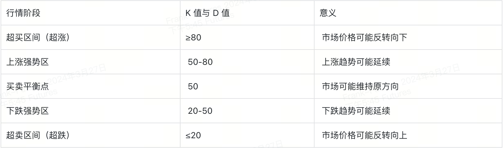 KD值在50以上时属于多头市场,做多有利;KD值在50以下时属于空头市场,做空有利。如下表KD 值分布表: