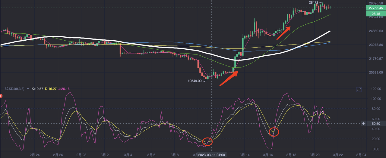 ①、当K线与D线均小于50,而K线向上突破D线时,表明市场处于一波强势之中,币价将再次上涨,可以加码买进或持币待涨,这是KDJ指标黄金交叉的一种形式。如下图所示:
