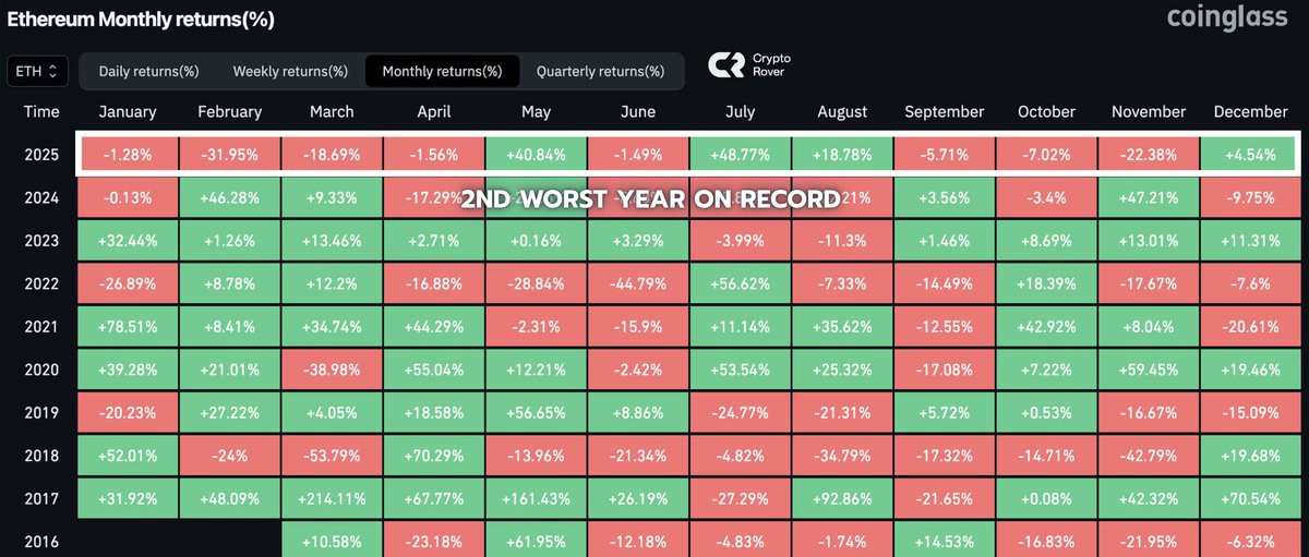 歷史數據為這種技術上的猶豫提供重要背景。從歷史角度來看,目前的以太坊正追蹤其有記錄以來第二差的年度表現。這與先前週期形成鮮明對比,過去這個階段經常帶來ETH一些最強的漲幅。