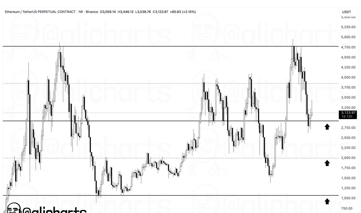 從技術面來看,以太坊仍被長期阻力區限制,該阻力區多次在週期中拒絕價格。周線圖展現出一個熟悉的模式:劇烈上漲後緊接著同樣激烈的回撤,買盤在ETH接近上方區域時難以持續動能。