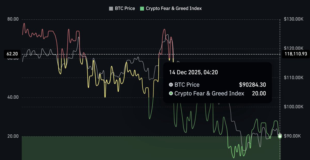 儘管BTC仍在接近90,000美元的區域交易,恐懼與貪婪指數已急劇下降至20,將市場牢牢帶入「恐懼」區域。這種背離暗示信心衰退的速度超過了價格的變動。