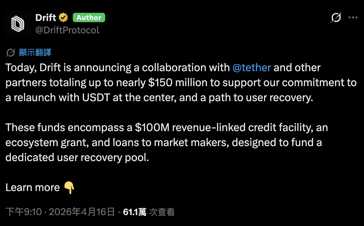 Drift Protocol 宣佈 1.5 億美元復原計劃,由 Tether 領銜支持並全面改用 $USDT 結算。此舉旨在應對北韓駭客造成的 2.95 億美元損失。