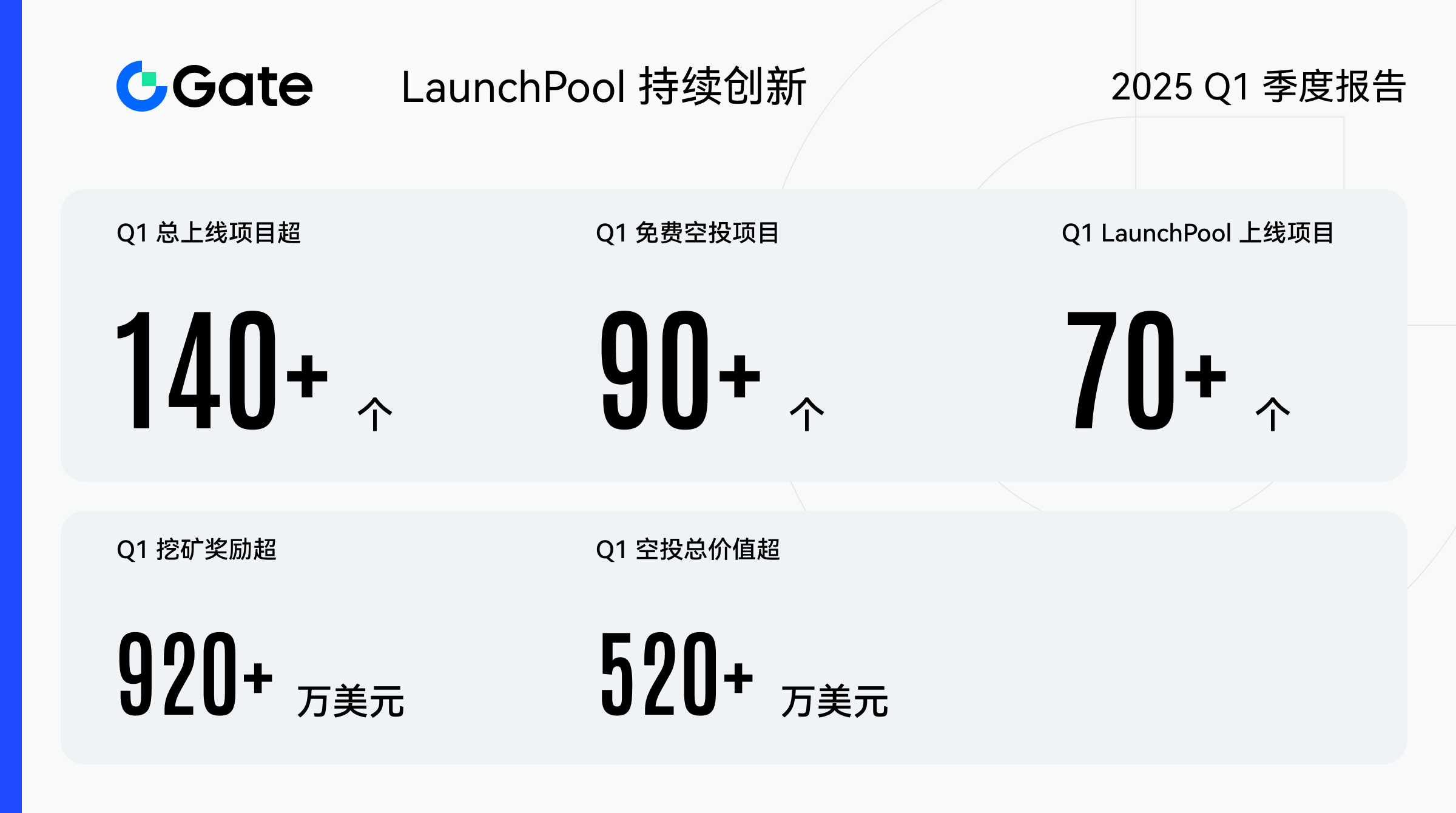 2025 年第一季度,Gate LaunchPool(原 Startup 新币挖矿)全面升级,上线超过 140 个项目,其中免费空投项目超过 90 个,空投总价值超 520 万美元。LaunchPool 上线项目超 70 个,挖矿奖励超 920 万美元。
