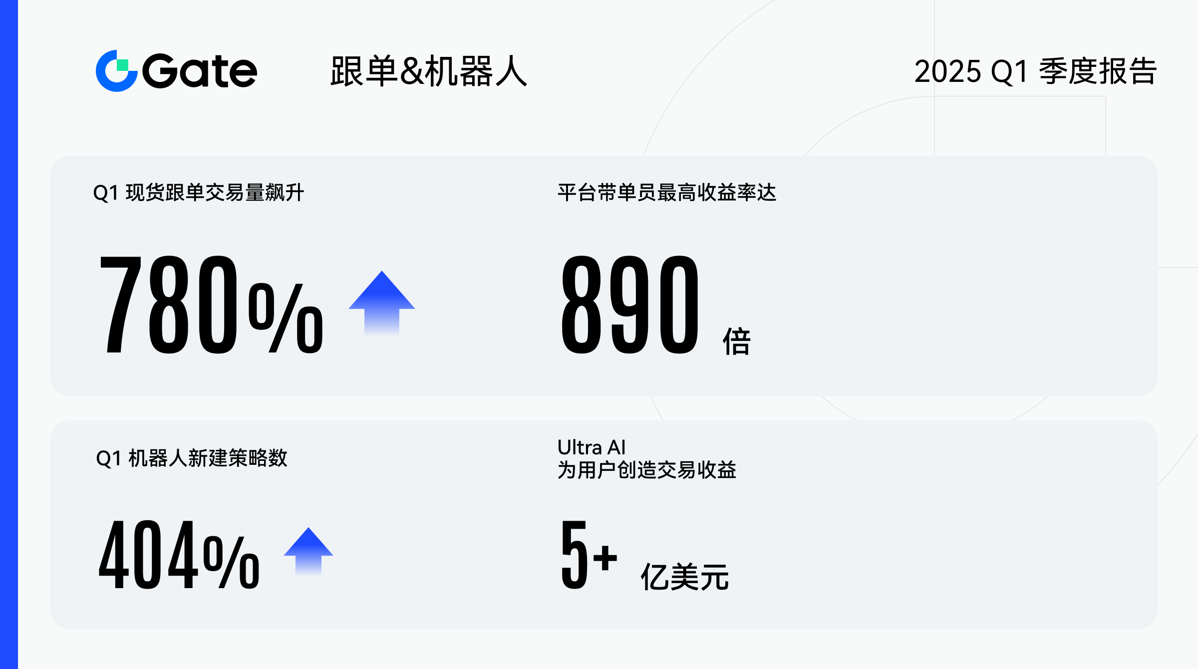 2025 年第一季度,Gate 在跟单业务、机器人策略及 ETF 产品领域均实现显著增长。在跟单业务方面,普罗米修斯自动风控系统的上线为用户构建了更安全的交易环境;现货跟单交易量飙升 780%,平台带单用户最高收益达 890 倍,为用户创造了超额收益机会。通过自动风控、跟单止损、无期限包赔券及 TG 小程序等功能,Gate 进一步完善了跟单产品的风险管控体系,显著提升了交易体验。